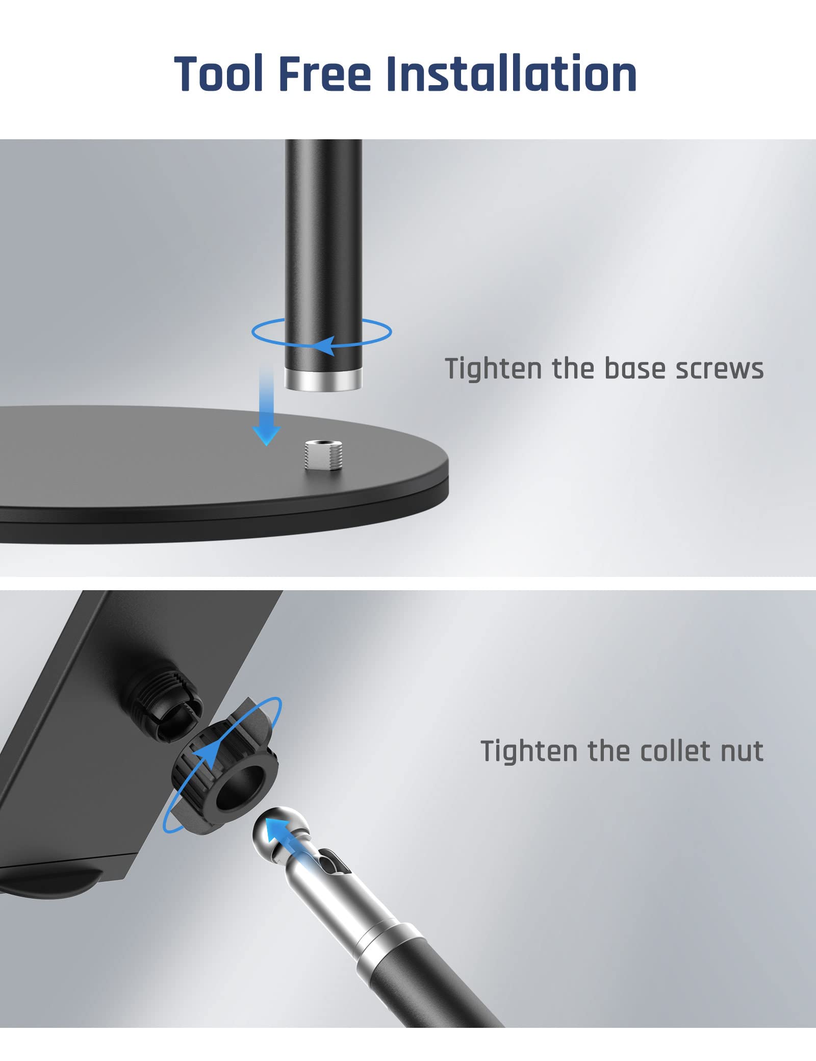 Built with a weighted metal base, aluminum alloy support rod, and anti-slip EVA pad, it offers rock-solid stability and a sleek, ergonomic design. The ABS plastic clip includes silicone pads to protect your device and built-in charging ports for easy access in vertical or horizontal view.