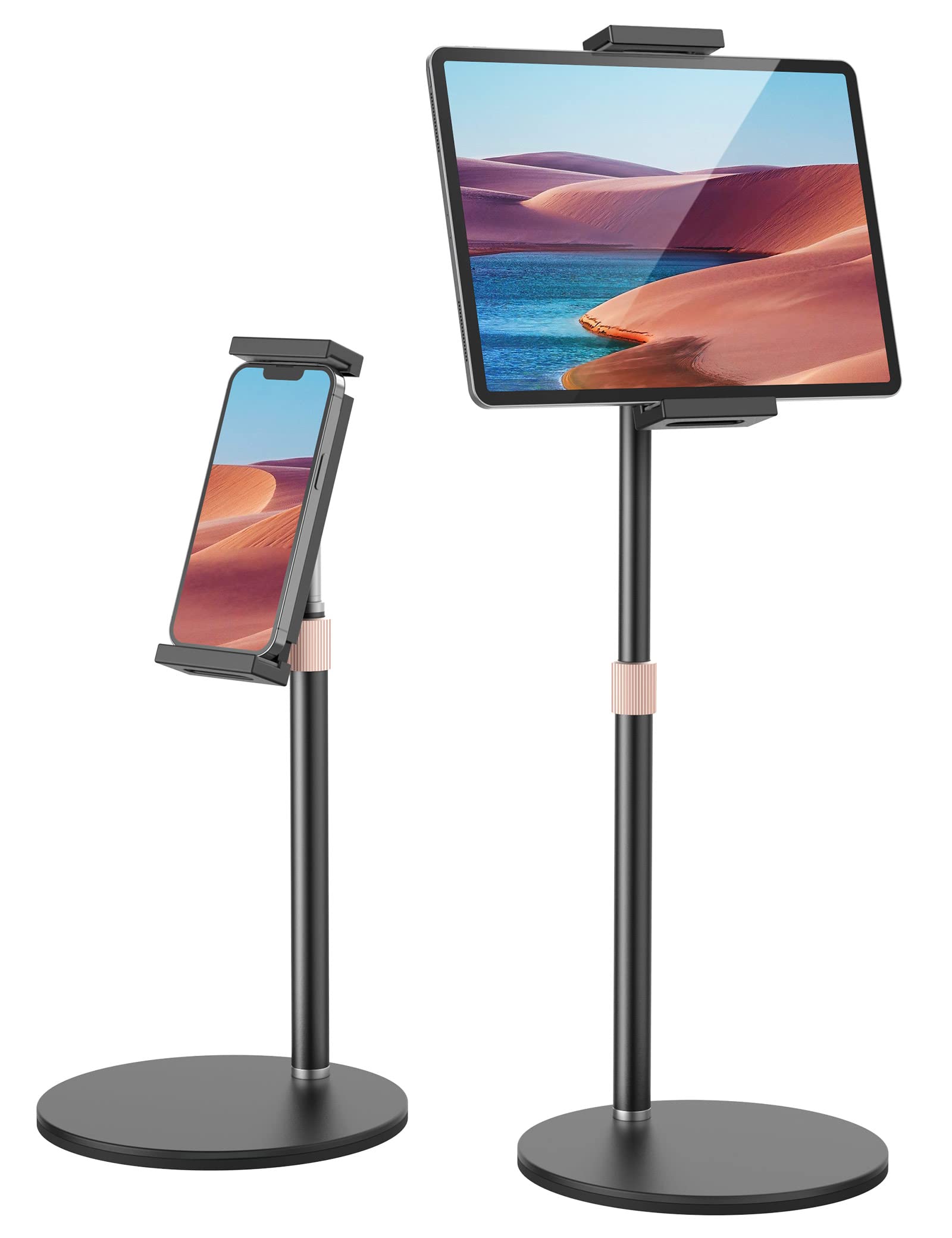 Enjoy hands-free comfort with this adjustable tablet stand, featuring 360° rotation, 90° tilt, and height adjustment from 12.4" to 18.9". Ideal for work, study, or entertainment—say goodbye to neck strain.