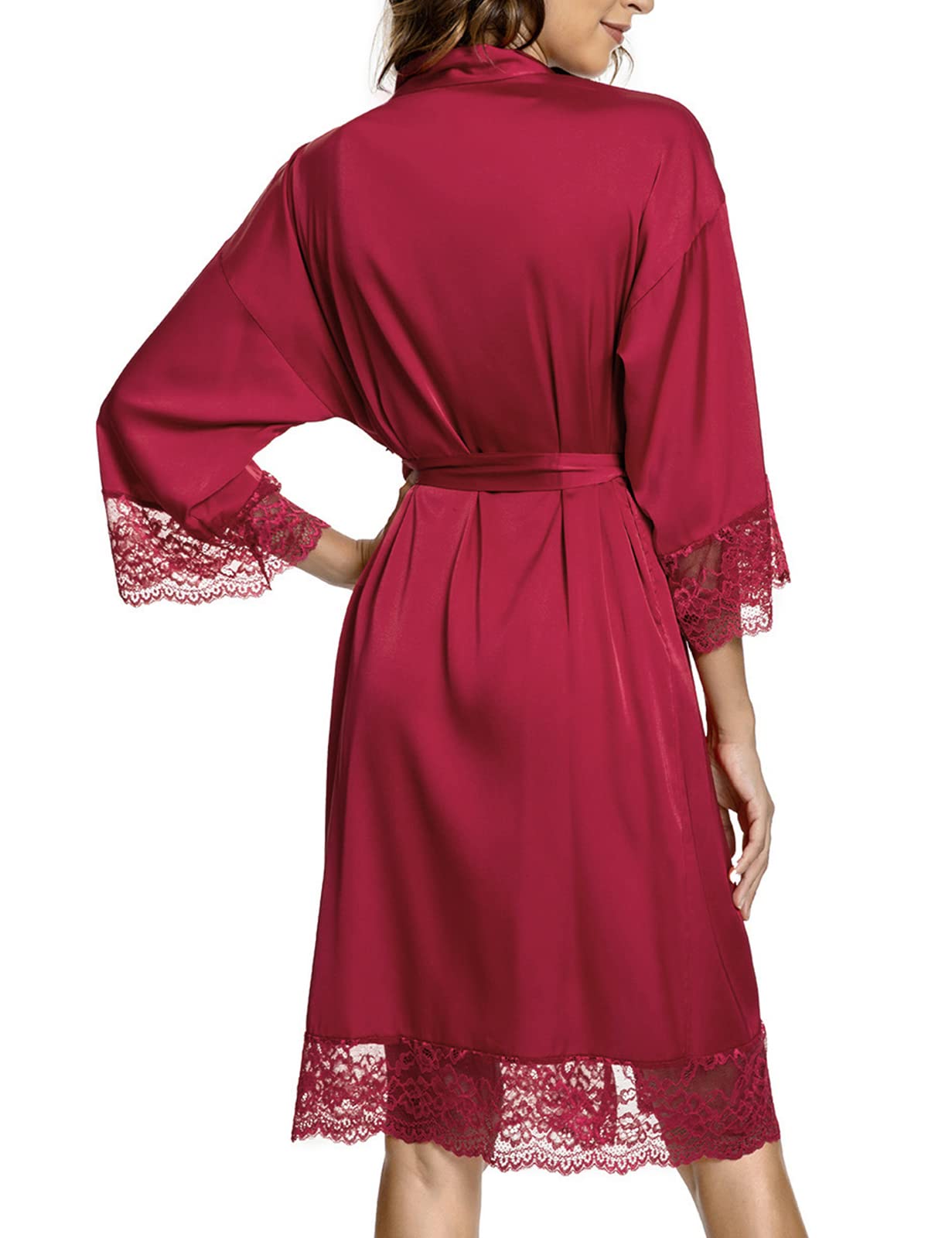 Crafted from soft, skin-friendly satin, this lightweight and durable dressing gown feels as luxurious as it looks. Featuring delicate lace trim on the sleeves and hem, a flattering waist tie, two side pockets, and mid-length sleeves for easy movement. The fine stitching and elegant design make it perfect as a bridal or bridesmaid robe—or for relaxing in style.