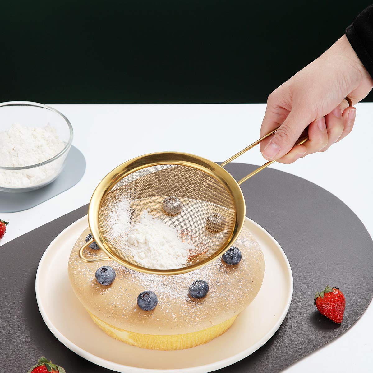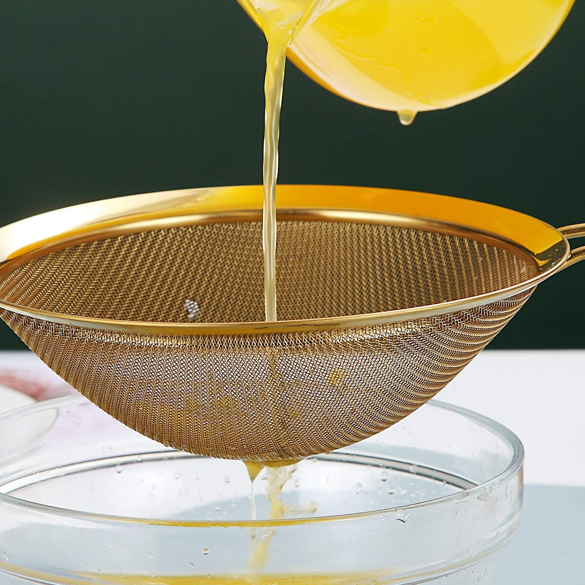 Elevate your kitchen with this elegant 3-piece gold strainer set in sizes 3.15" (8cm), 5.5" (14cm), and 7.1" (18cm)—ideal for all your straining needs.