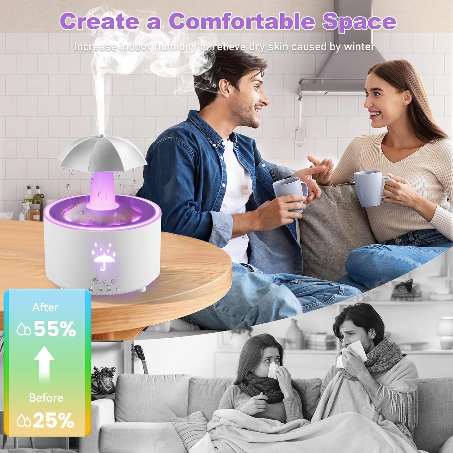 Add a touch of charm and calm with this umbrella-shaped humidifier, featuring a realistic raindrop effect and soothing rain sounds under 36dB—perfect for relaxation, sleep, or meditation. Its rotatable top adds a fun, interactive twist to your décor.