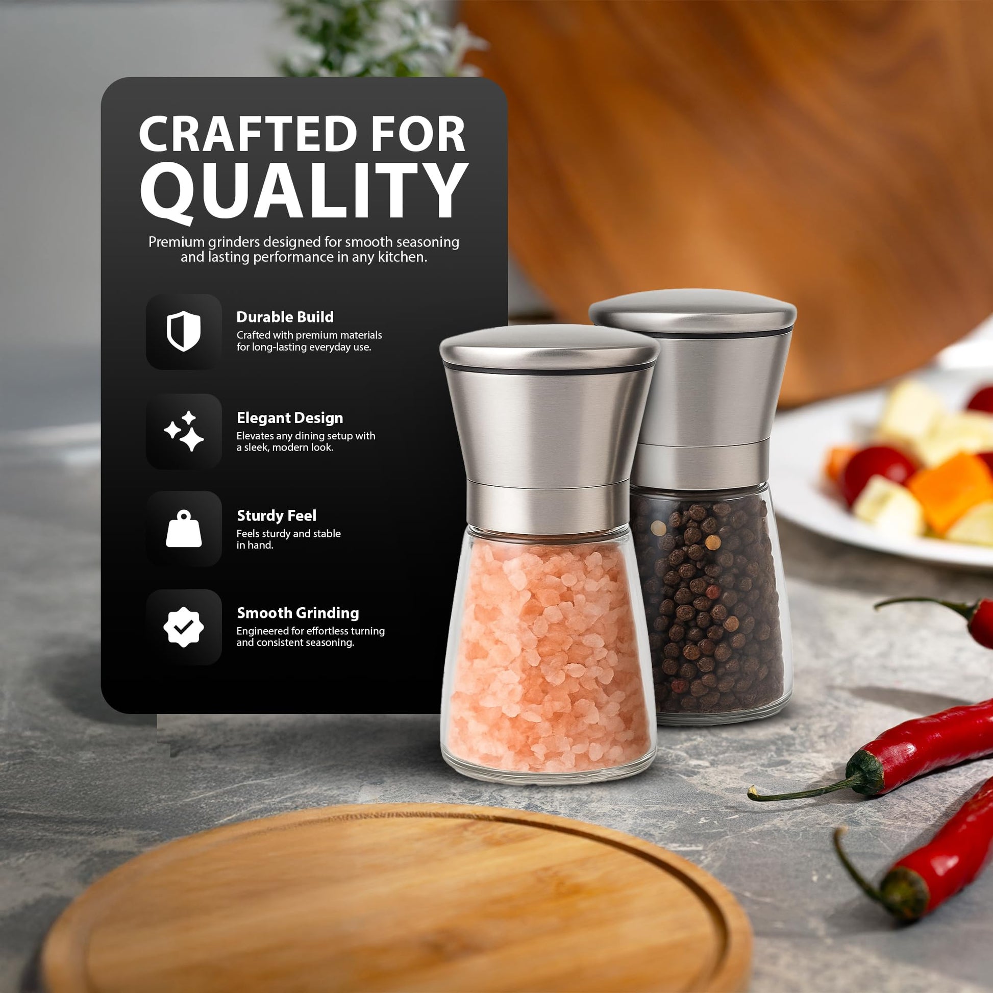 Upgrade your table with this modern grinder set, crafted from durable stainless steel and glass for a clean, stylish look that’s made to last.